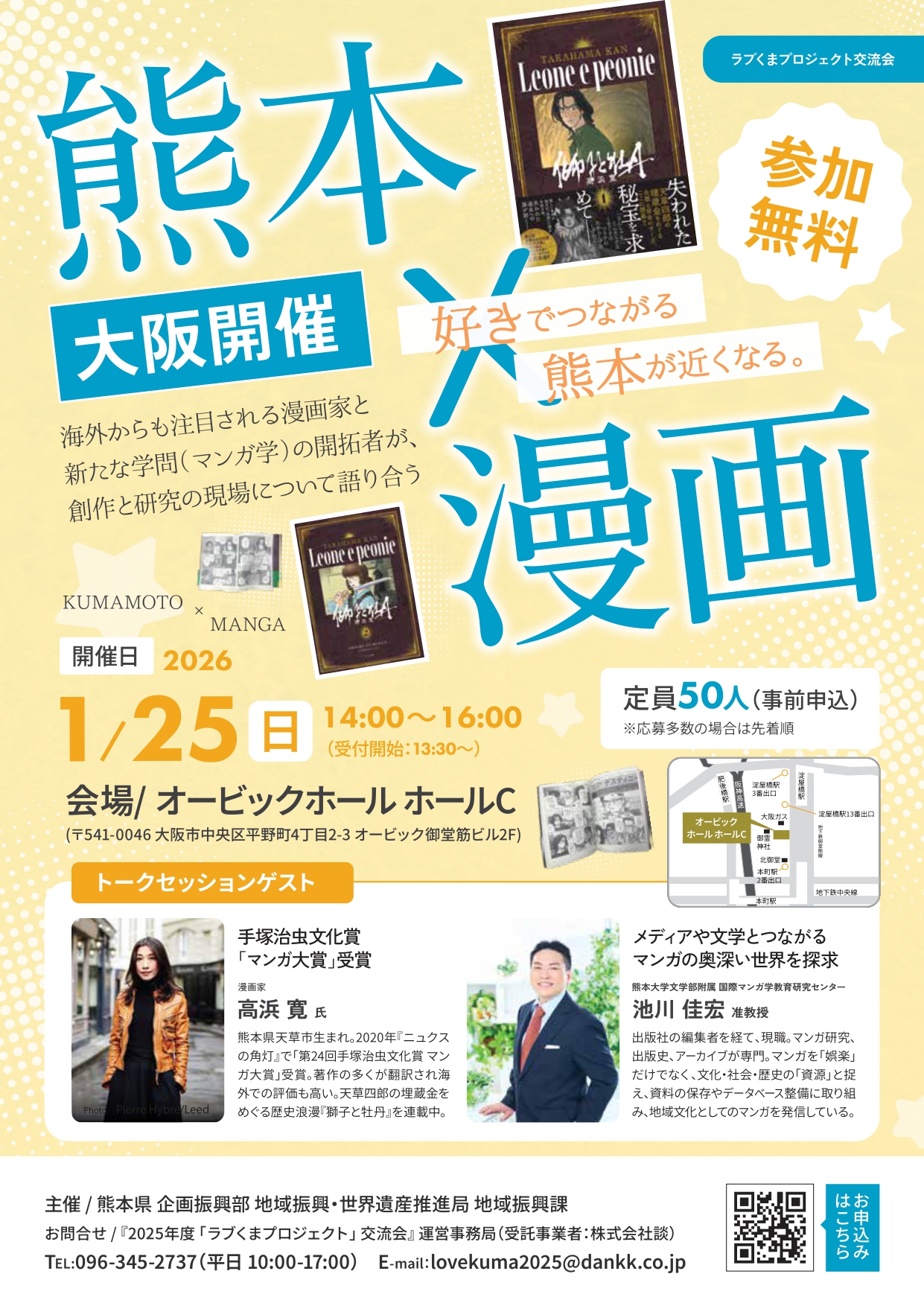 1月25日に、熊本県への移住プロモーション企画「ラブくま交流会」イベント「熊本×漫画」にマンガ家の高浜寛先生と当センター兼務教員の池川佳宏准教授が登壇します